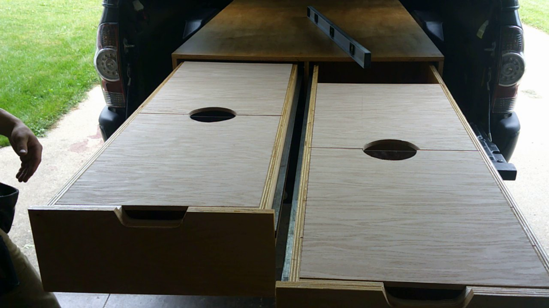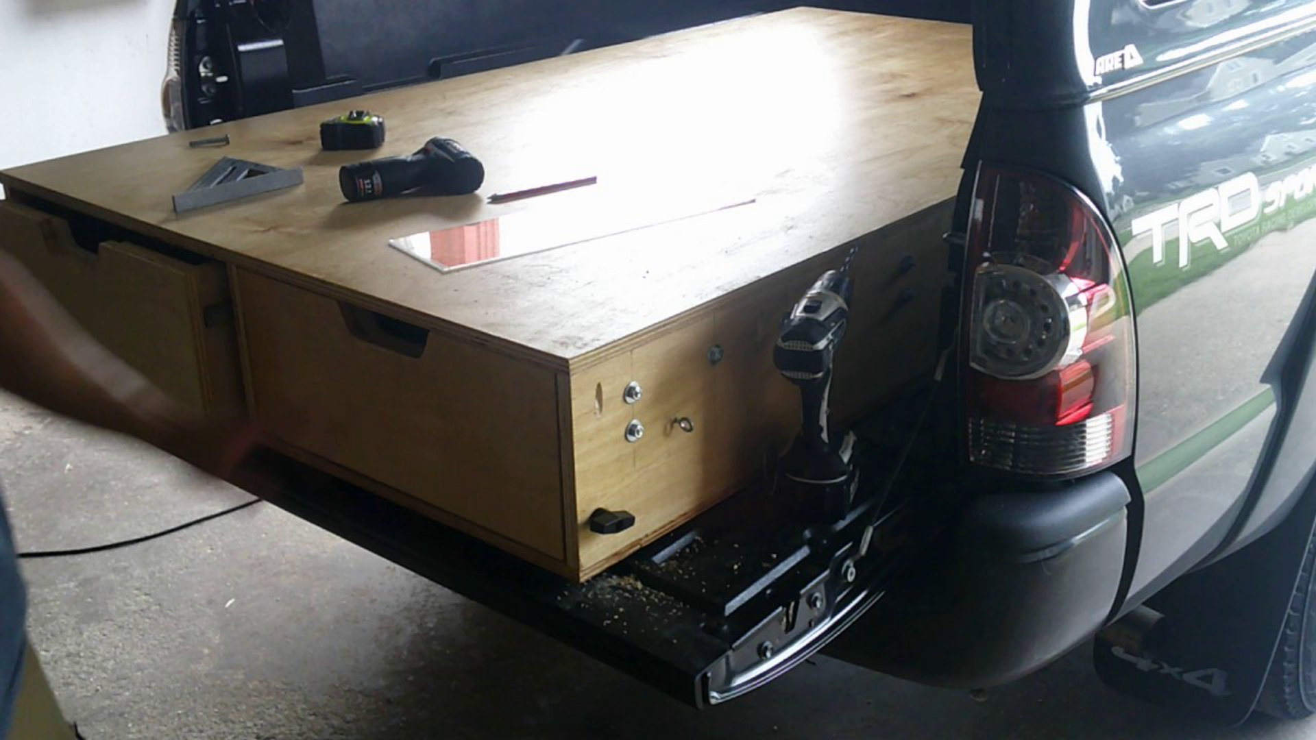 I built two pullout drawers for my Tacoma 6’ bed. Along with these, I also made a platform for hauling things on top of the drawers, for sleeping during a backcountry road trip, or when my life really takes downward spiral and I have nowhere else to sleep. The drawers are the length of the bed and can pull out to about 5’ while holding my bodyweight which makes them extremely solid. I accidentally tested the integrity of the drawers once when I forgot to close them and then took a drive down the freeway. While I wouldn’t recommend it, I can say for certain that these drawers are solid, unlike my mental state.