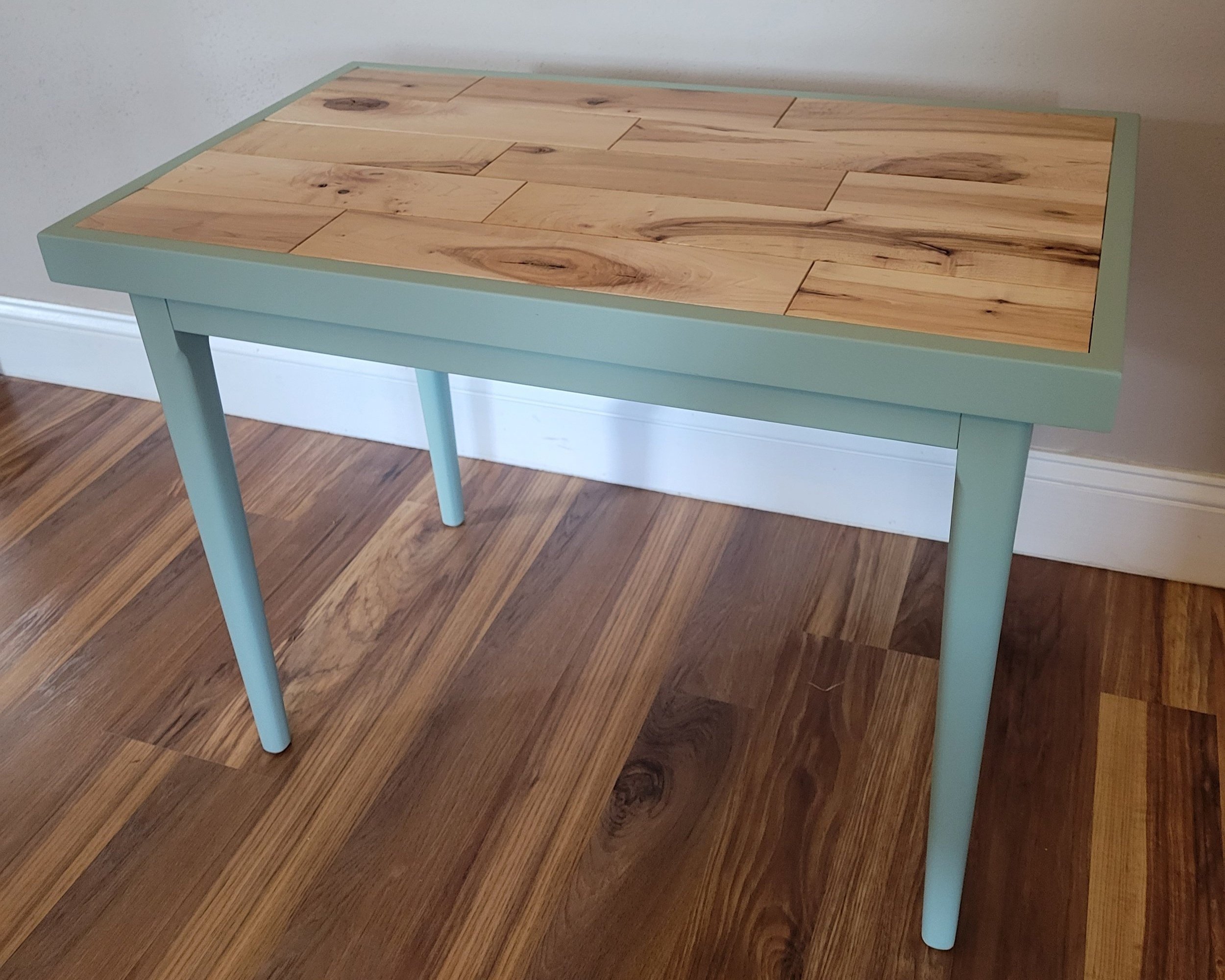 There were many options for a top for this. I chose to make a new one rather than just the paint the old one. I decided to make a top out of Hickory flooring that I had left over from a bar I had built. I made it the same the way I had built the bar. I used some scrap plywood I had for a base which I would lay the flooring over. I also made a frame around the flooring to hide the edges. I built this frame out of maple strips that I had reclaimed from an old couch I had deconstructed. I used maple because I planned on painting the frame. Maple is one of the best woods to paint because it has a very tight grain, which means the grain won’t show through the paint like an open grain wood, such as Oak.