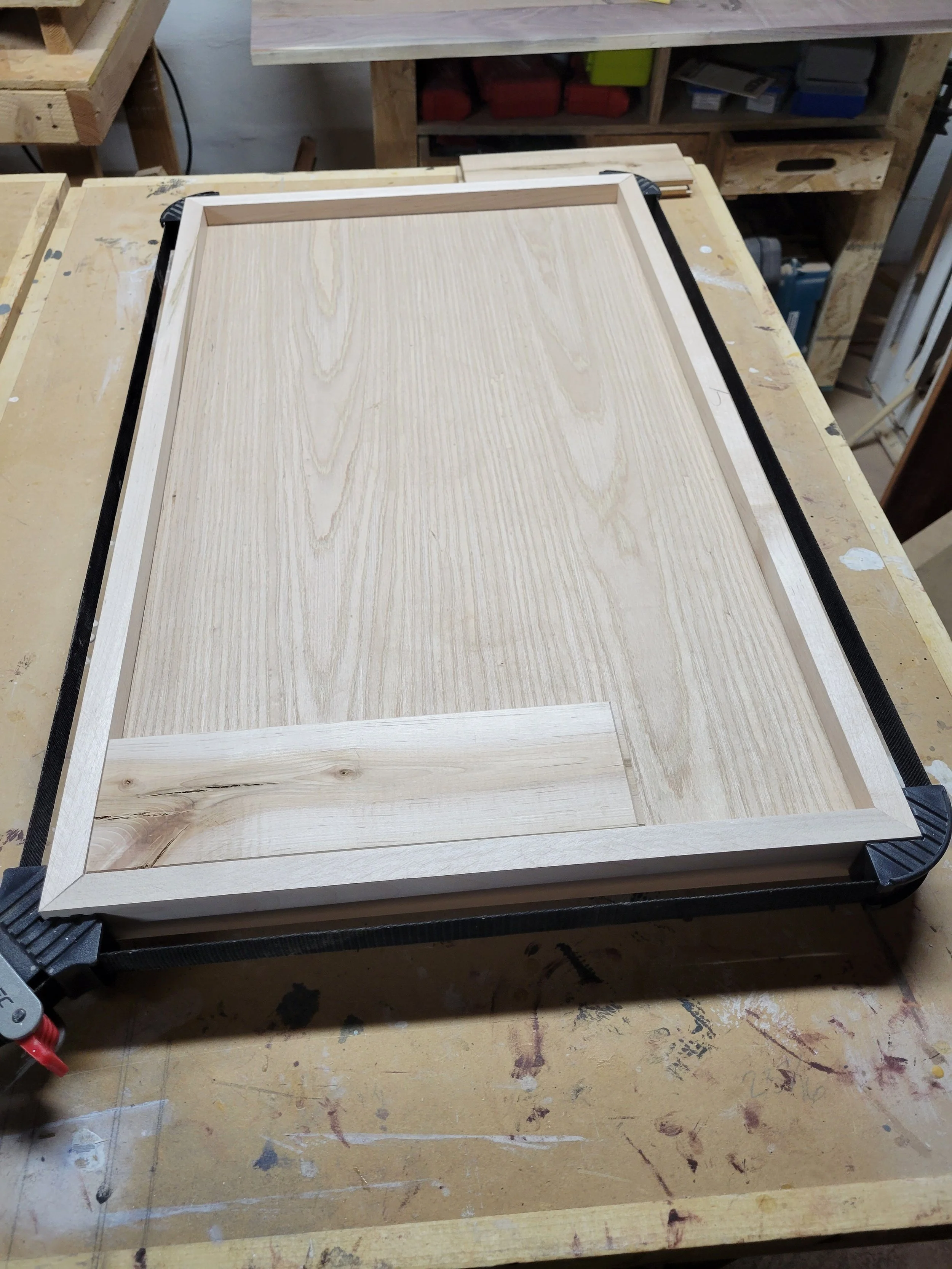 I then ripped the 3/4 thick Maple strips I had to equal the the thickness of the base plus flooring, which came out to 1.5”. I cut miters on each end to get nice tight joints. I then glued and clamped the strips around the plywood base. I also used some finish nails to help secure the frame to the base, which I would then cover with putty before painting.