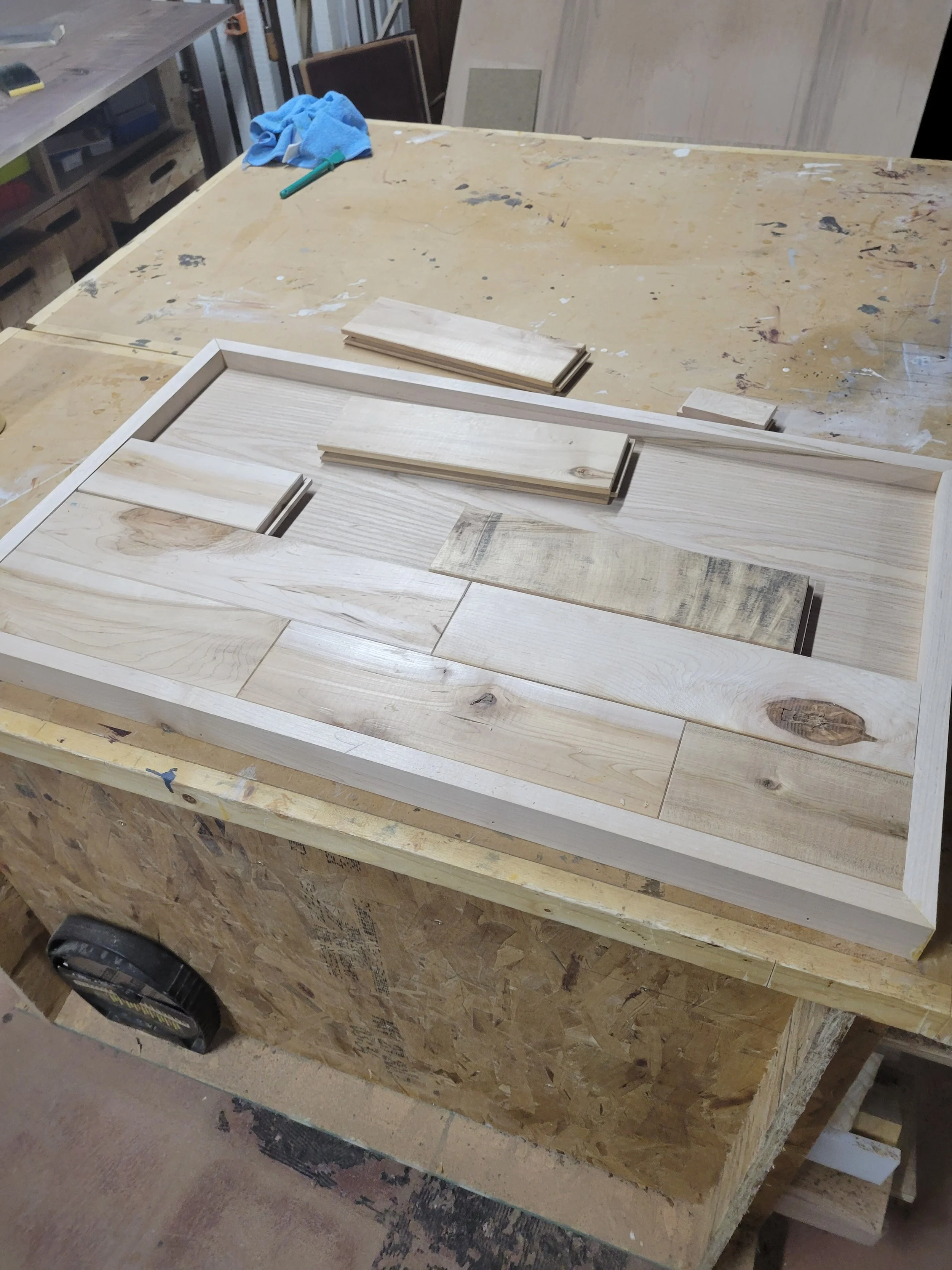 I had a piece of plywood that was almost the same size as the original top. The only cut I had to make was to match the width of the flooring I was going to use. I found that 5 rows of flooring was very close to the width of the original top so I cut the plywood to match that width.