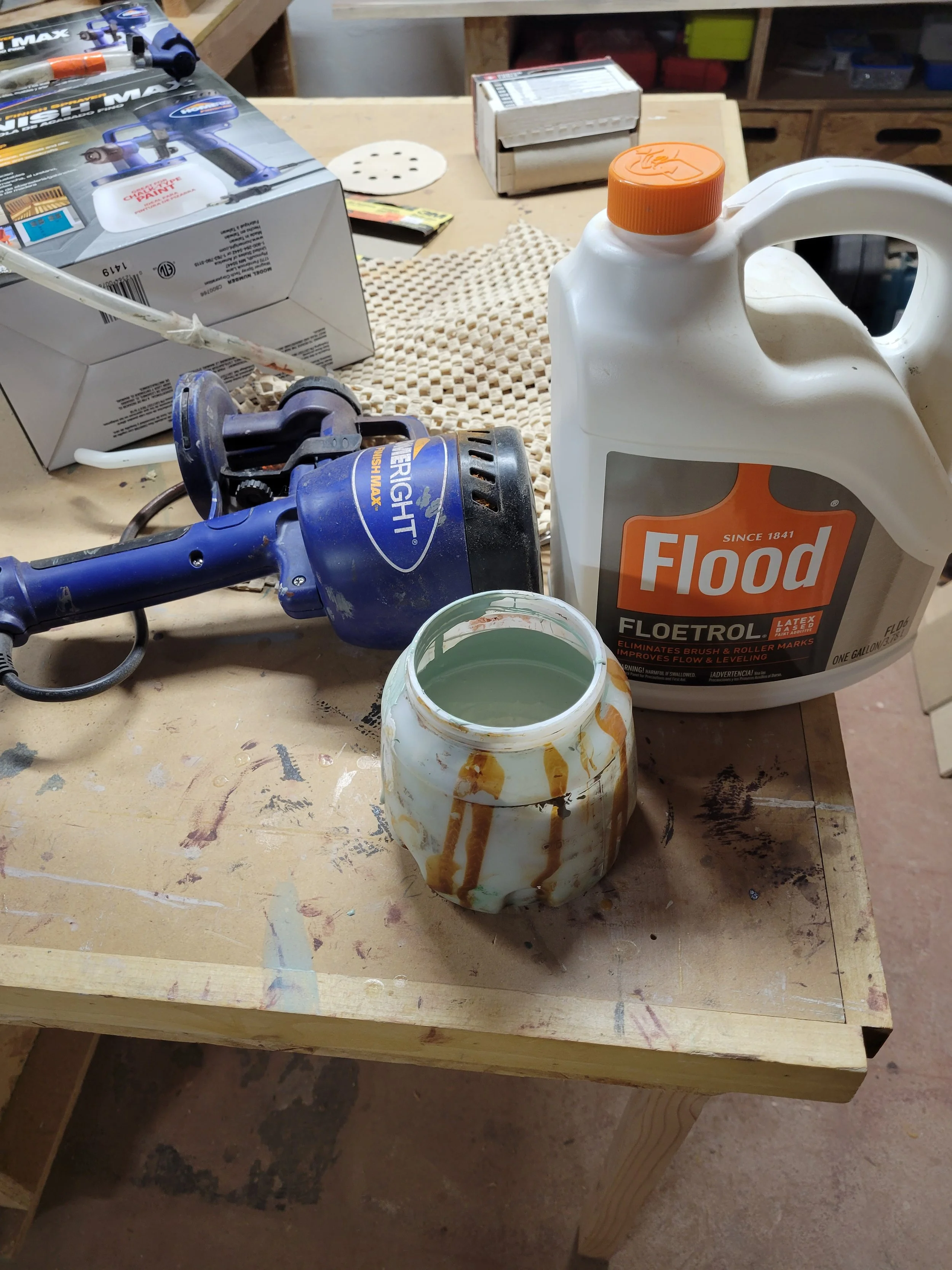 Paint by itself is often too thick for my sprayer so I used Floetrol to thin it out a little bit. On a side note I add Floetrol to all my paint, even if I’m brushing it because it helps smooth out brush strokes too. It really is one of my favorite chemicals.