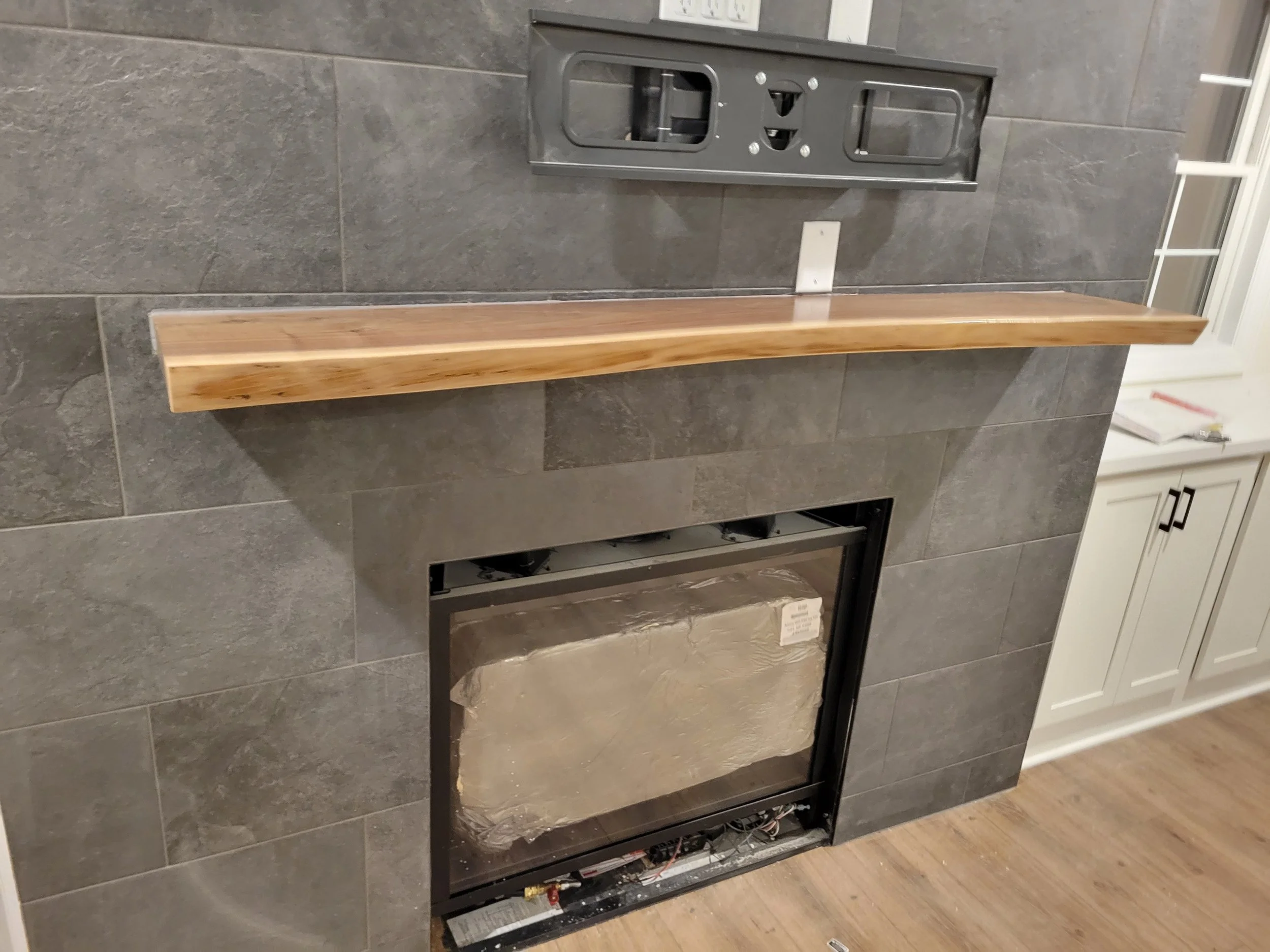 Here is where the process gets a little more complicated. This project was particularly weird because it was for a new build house. The wall it was going to hang on was going to be fully tiled so I decided it would be best to make a spacer board that was the same thickness and length of the panel. I mounted this to the wall after the drywall went up but before the tile. That way the tiler could go around the spacer board. The plan was that once the tile was up I would just remove the spacer board and be able to slide the mantel into that void. Little did I know this was just one more void that I would have trouble filling.